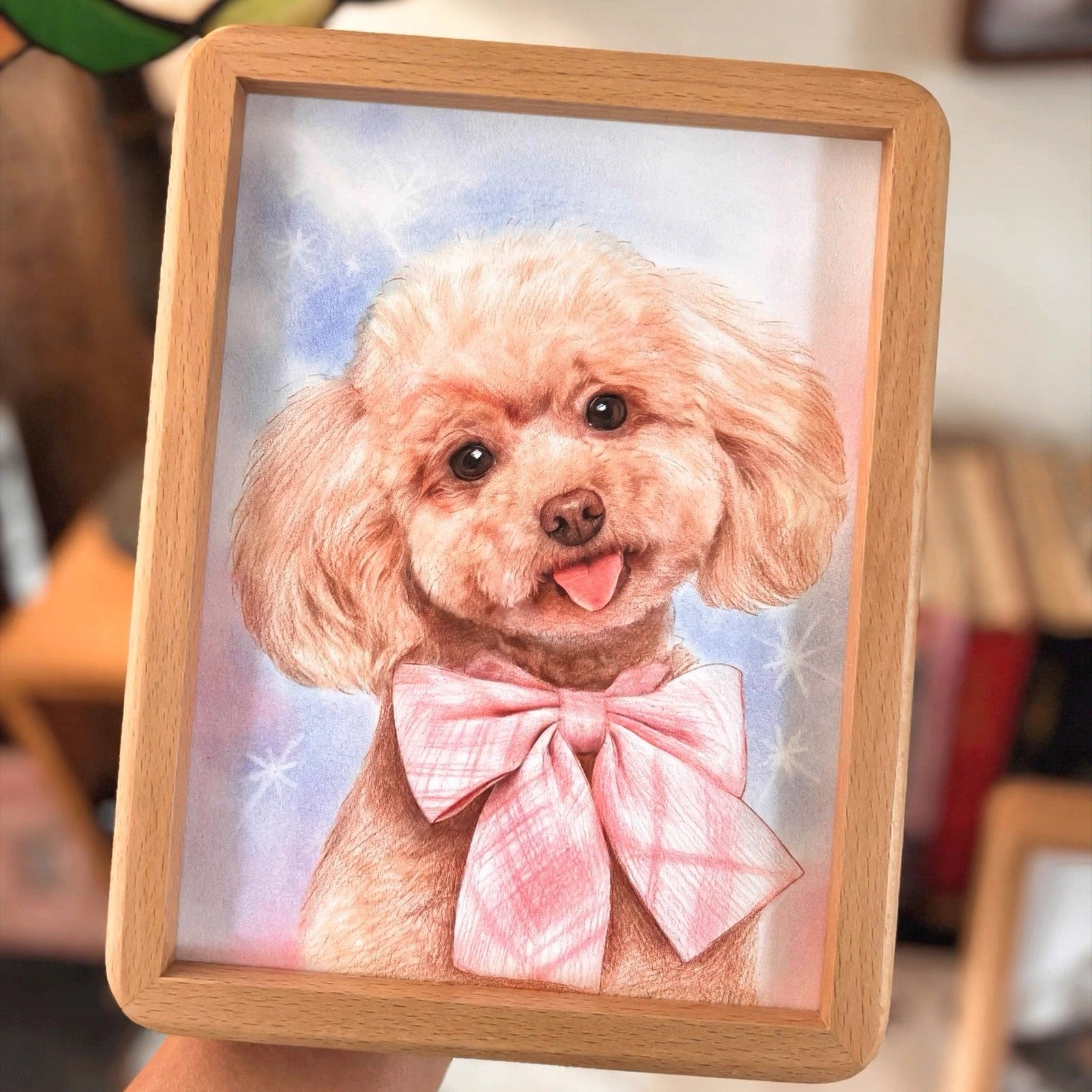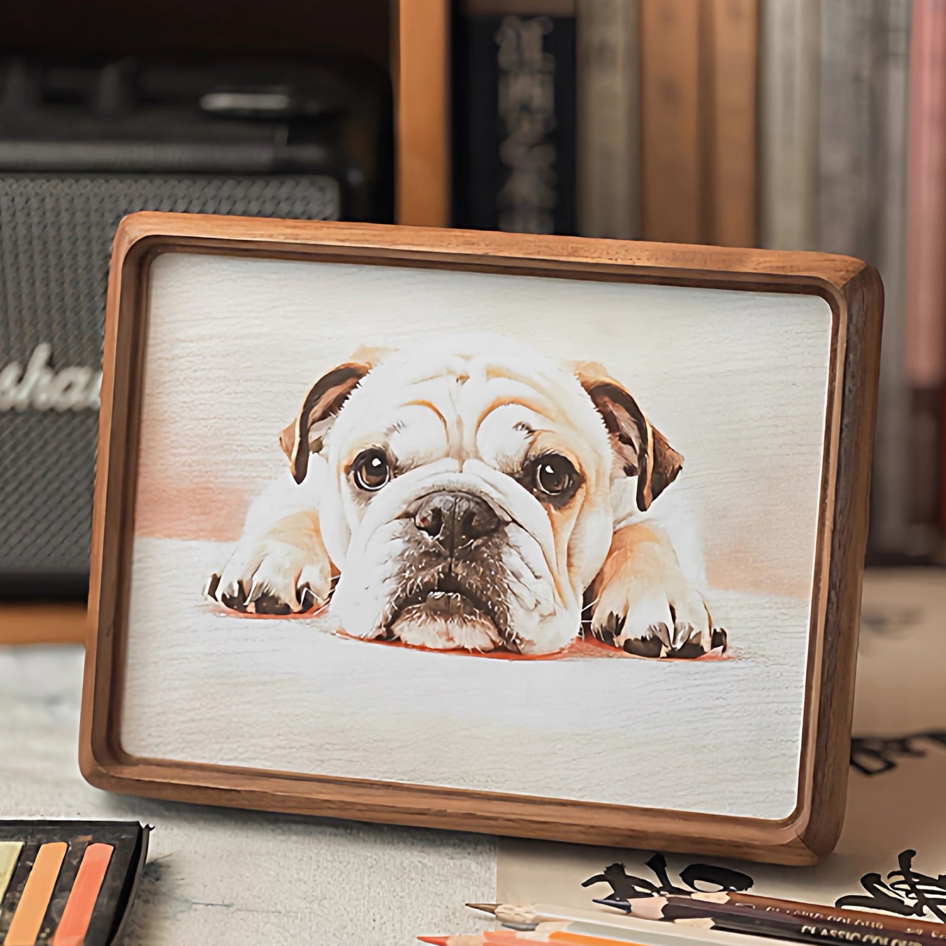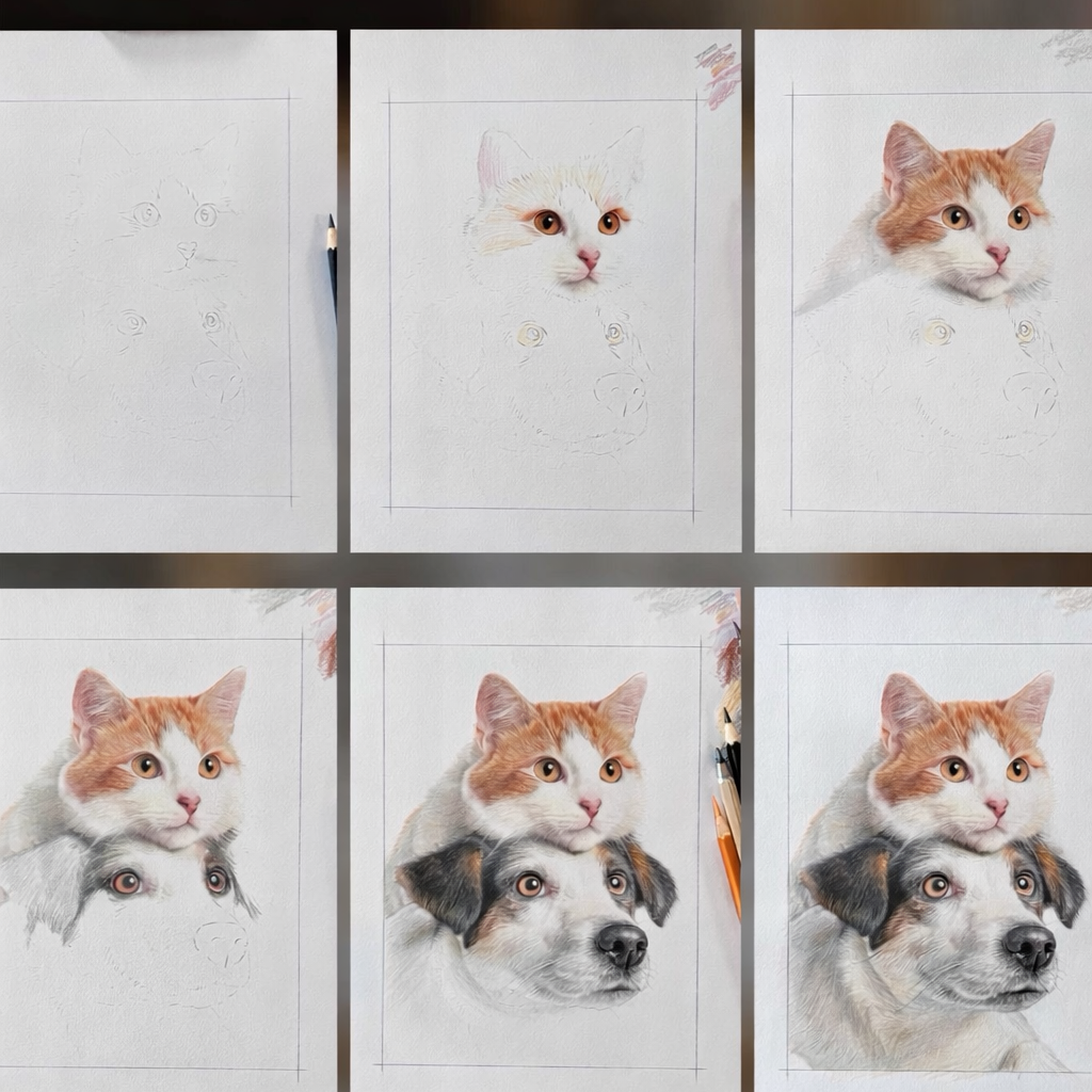 Our colored pencil pet portraits transform your pet’s photo into a hand-drawn–style sketch, blending delicate color with fine pencil lines to capture warmth, expression, and personality.